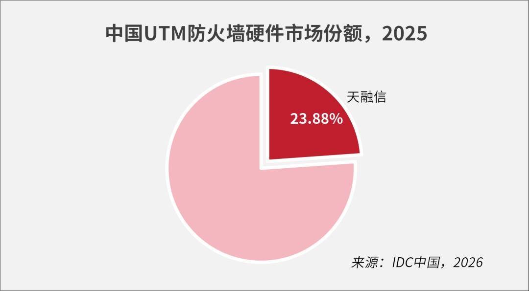 近日,国际数据公司IDC发布《2025年第四季度中国安全硬件市场跟踪报告》。报告显示,天融信(002212)防火墙以23.88%的市场份额再度蝉联冠军,至今已连续26年稳居国内市场榜首。